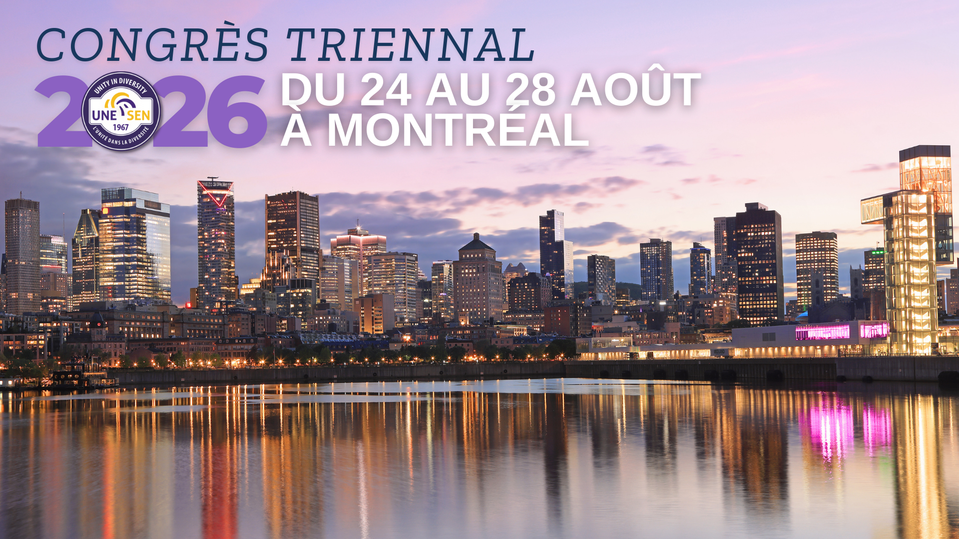 Le Congrès triennal de 2026 du SEN se tiendra à l’hôtel Fairmont La Reine Elizabeth du 24 au 28 août 2026. Les délégué·e·s devront également assister aux caucus le dimanche 20 août; elles/ils doivent donc planifier leurs déplacements pour arriver à Toronto le samedi 19 août.